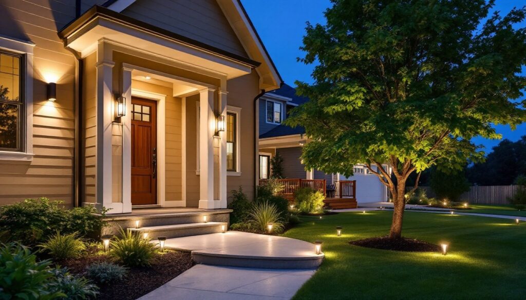 From a design standpoint, strategic lighting extends usable outdoor space into evening hours. A lit patio or deck becomes a functional room rather than dead space after 7 PM in winter months. Uplighting architectural features or specimen plants adds depth and visual interest that flat daytime sun can’t achieve.